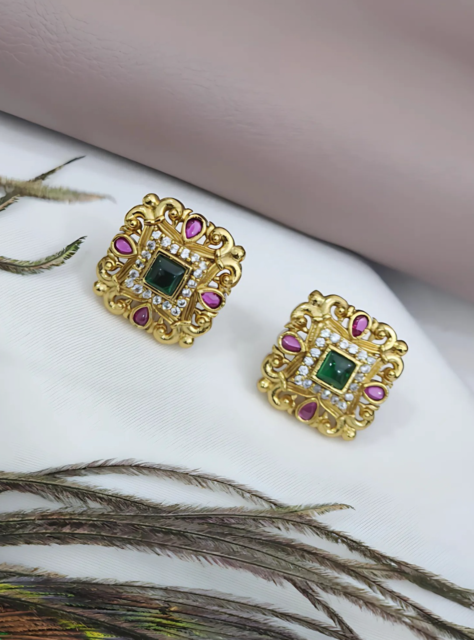 These earrings studded with Purple and green CZ stones, are a staple in anyone's wardrobe. These lightweight but stunning earrings will be topic of the day wherever you wear them.