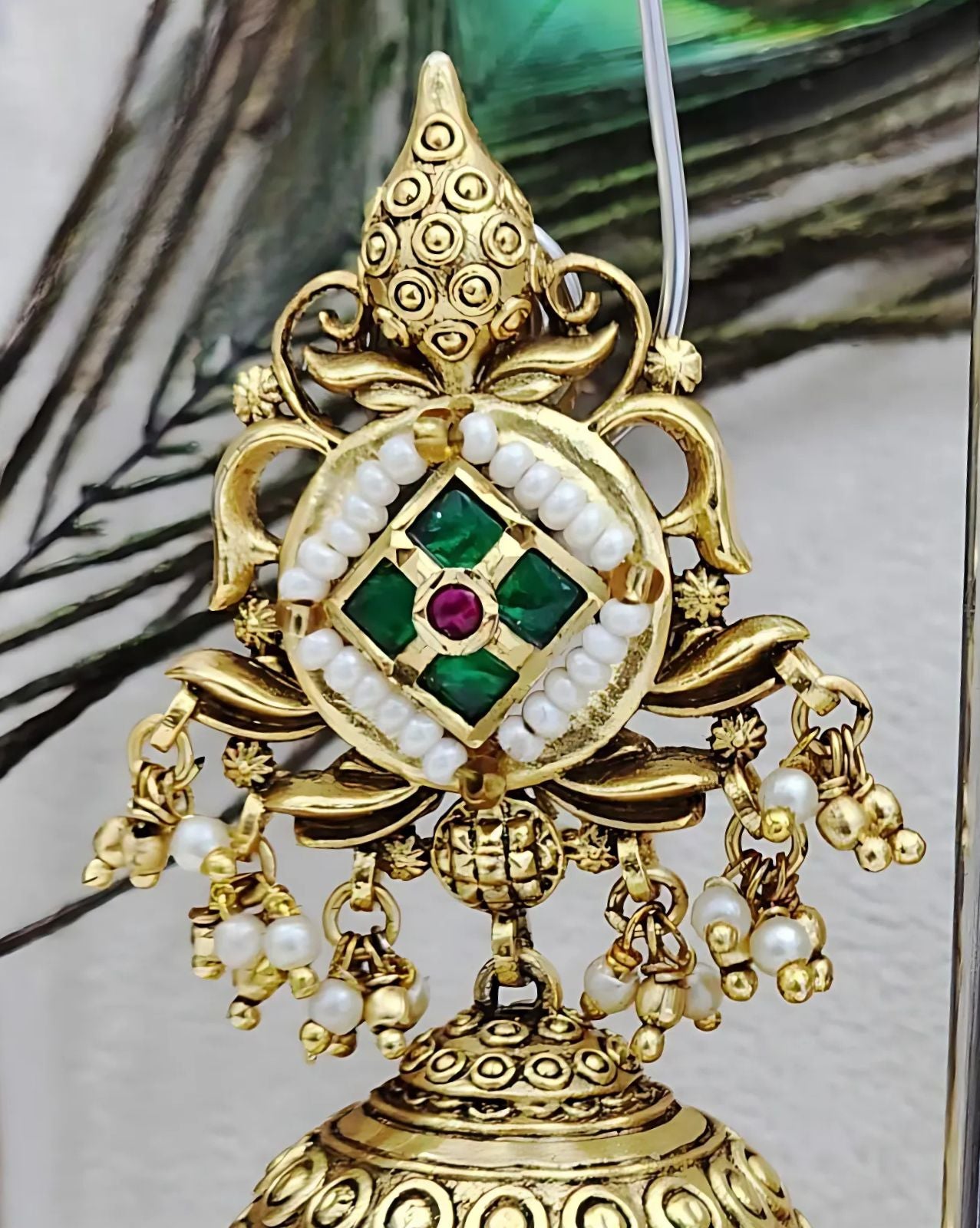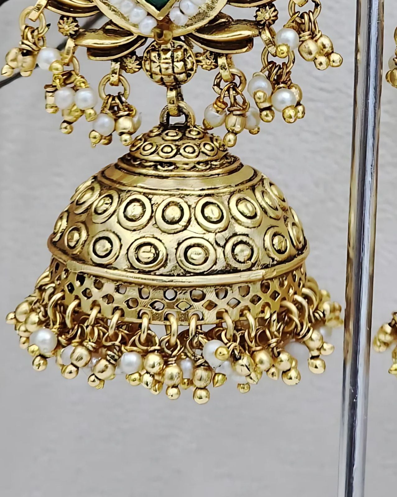 The earrings' elaborately detailed dome-shaped Jhumka is adorned with elaborate motifs that harken back to the craftsmanship of ancient India. These earrings, which are adorned with pearls, kundan components, and vivid red and green stones, give off an air of royalty. Their attraction for special occasions is increased by the elegant movement added by the dangling design.