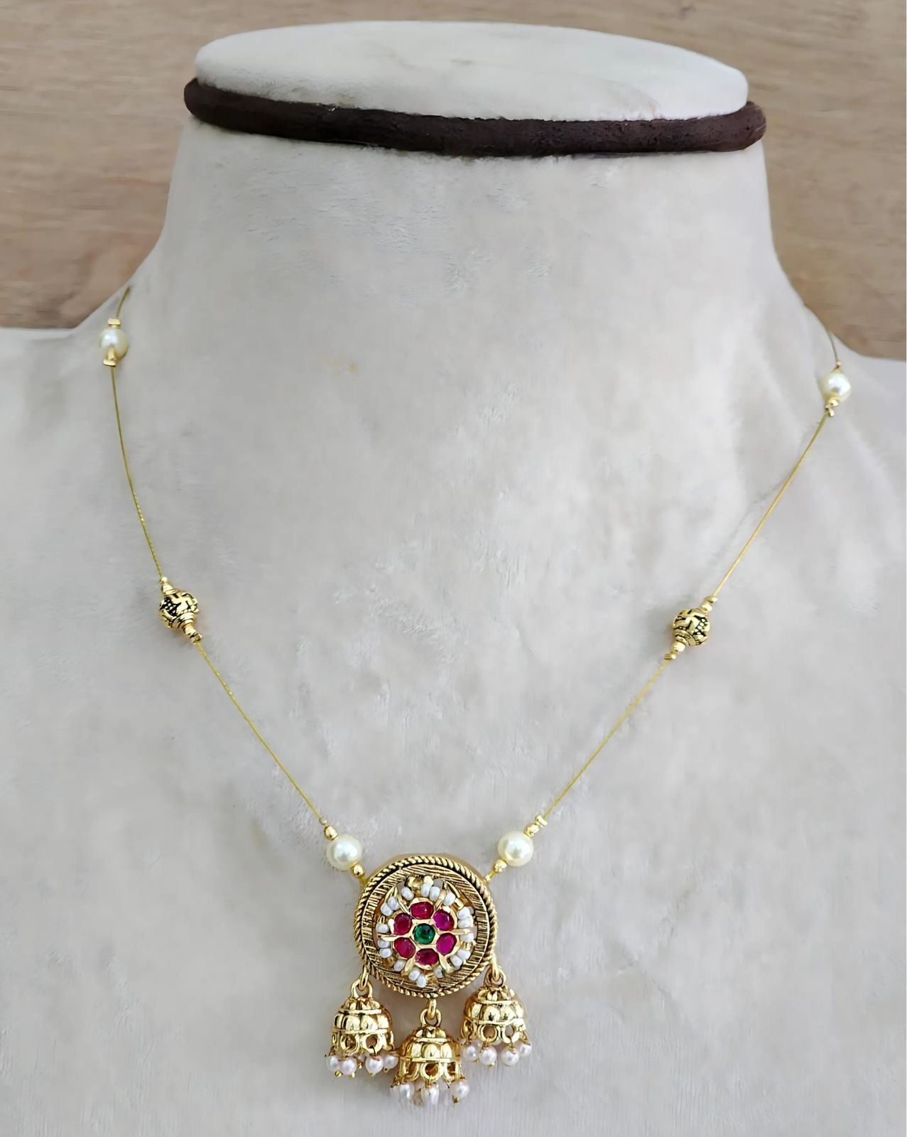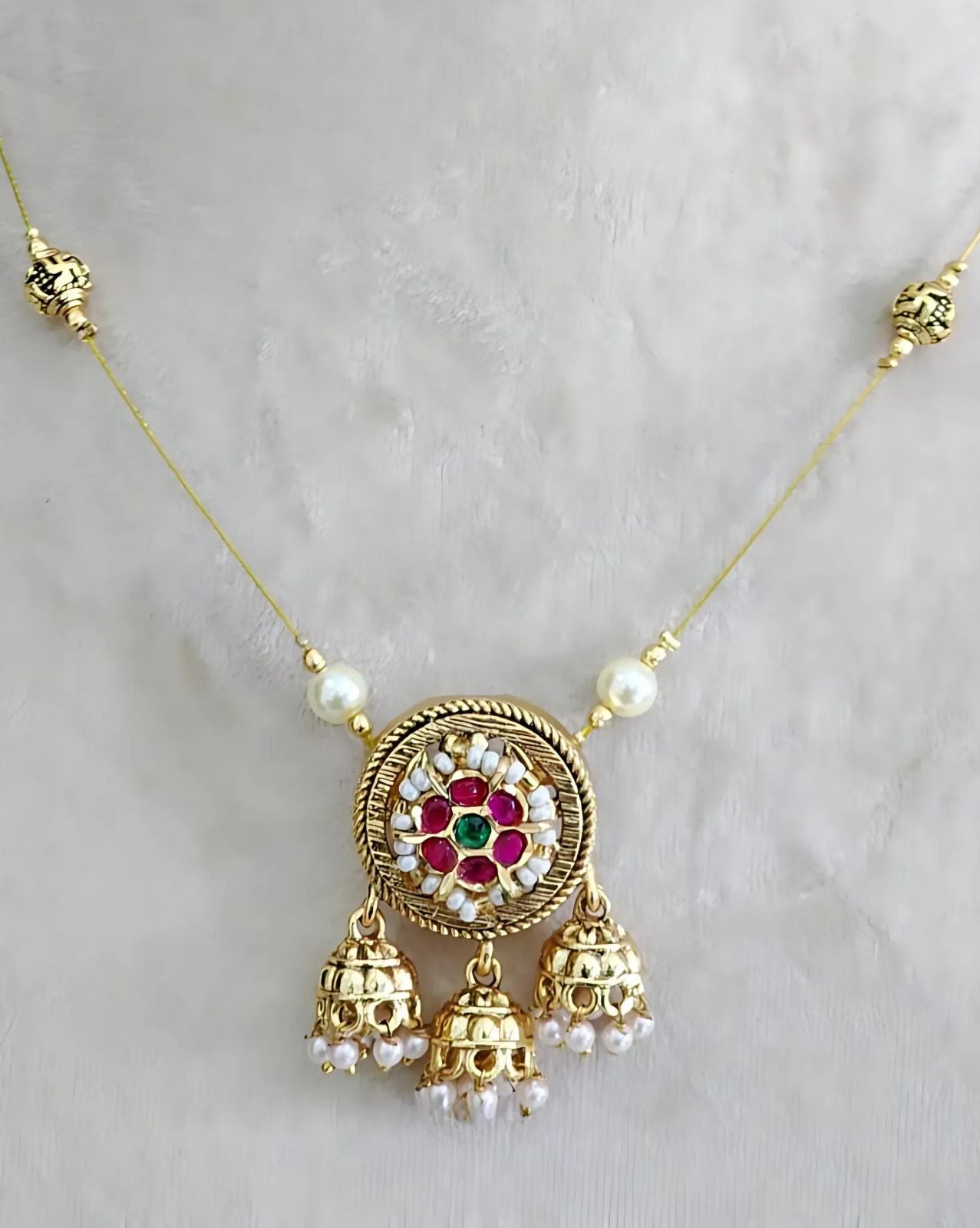 An exquisite, invisible chain design adorns this tiny Jadau Kundan necklace. A circular gold motif frames the necklace's main pendant, which is embellished with beautiful floral Kundan work and set with red and green gemstones. A traditional touch is added by the three tiny, hanging gold jhumka charms that hang from the pendant.