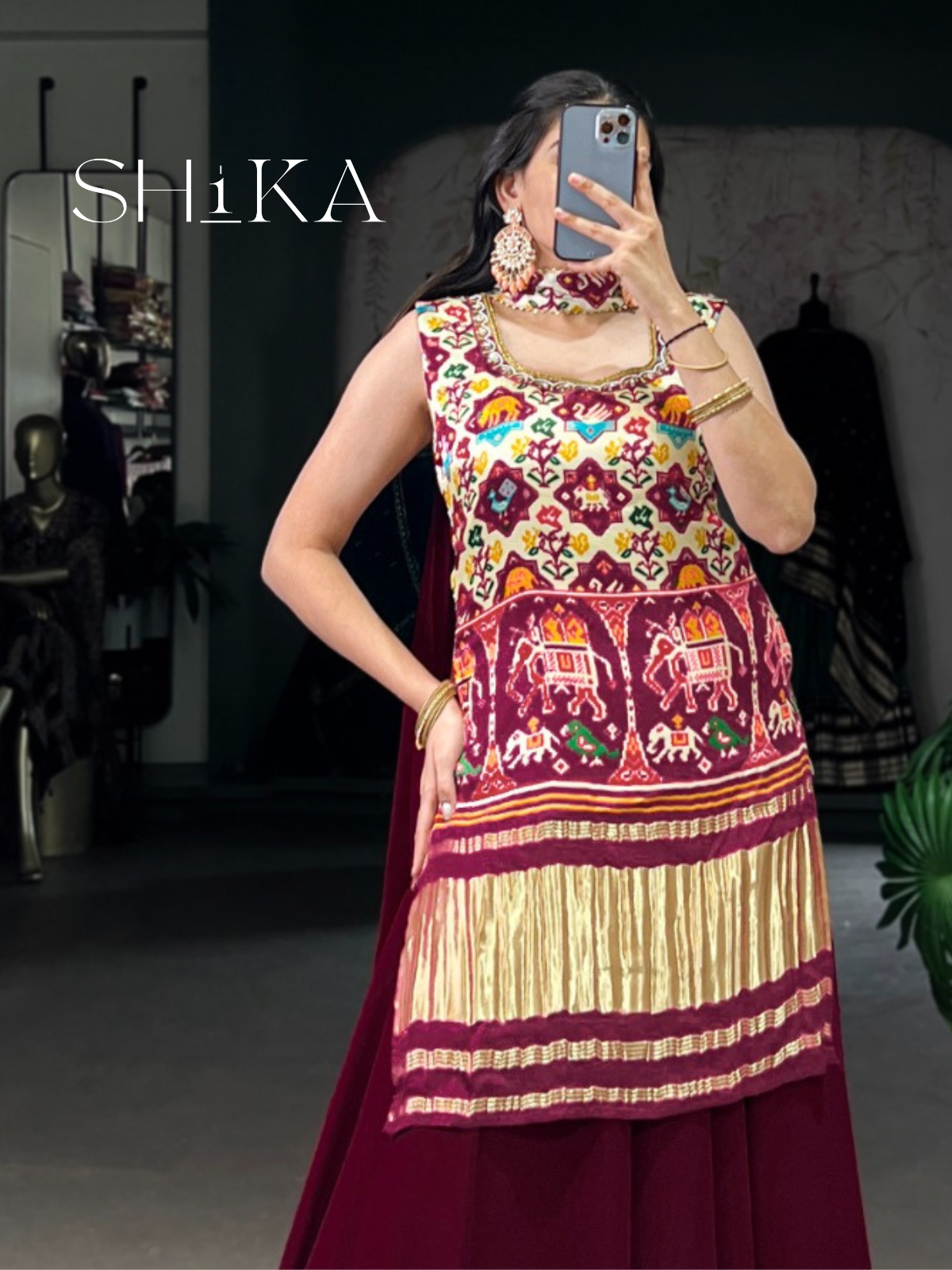 This elegant set includes a stitched gaji silk top featuring printed and handwork details with a comfortable adjustable chest fit. The plain georgette palazzo pants come with an elastic waistband for ease and style. A matching georgette dupatta with delicate lace trim completes the look, perfect for both festive occasions and casual wear.