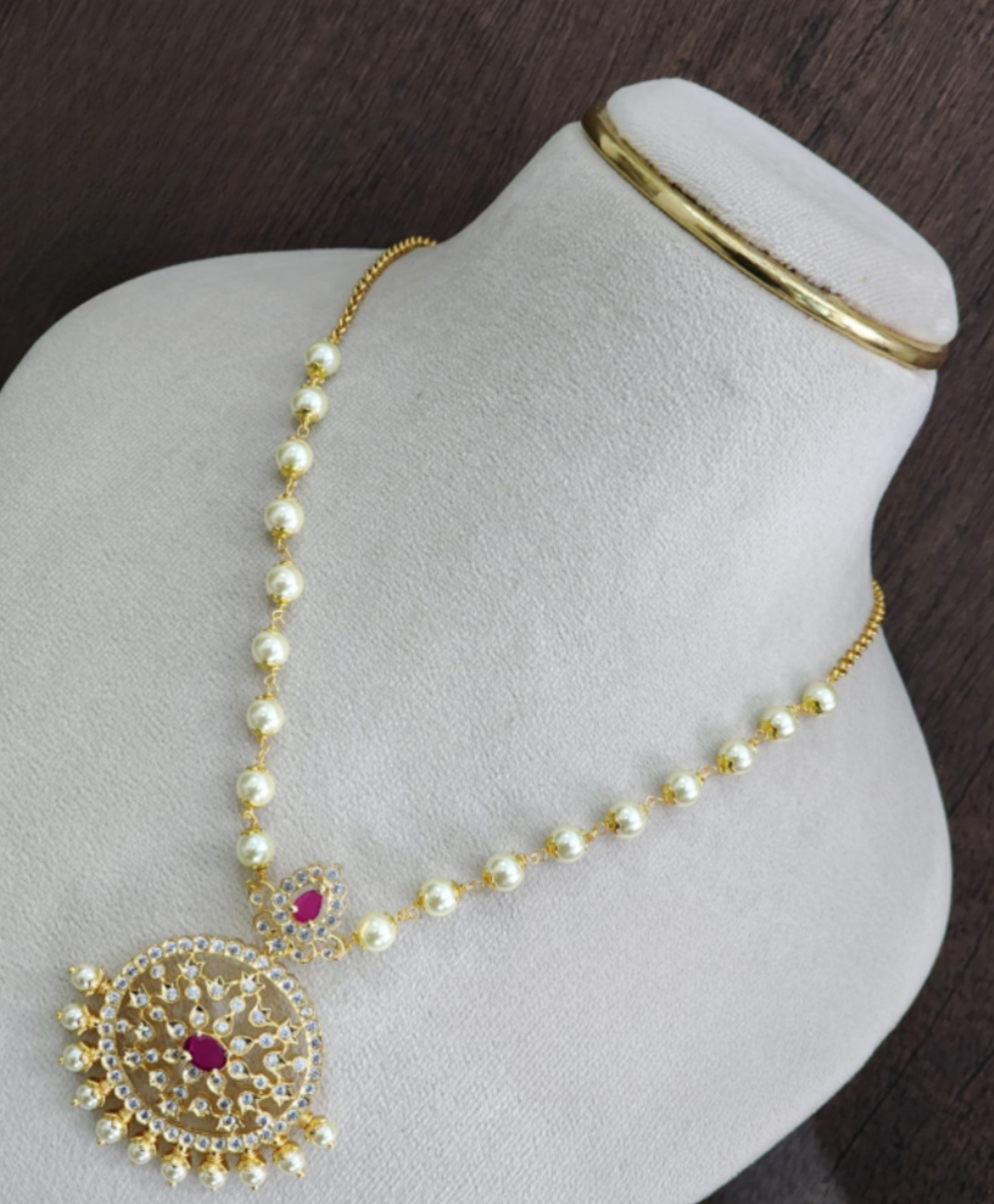 Grace your neckline with this stunning CZ (Cubic Zirconia) pendant adorned with delicate pearls on a Moti Mala chain. The intricate design, accented with red stones, pairs perfectly with the sleek bangle for a timeless, elegant look. Ideal for traditional and festive occasions.