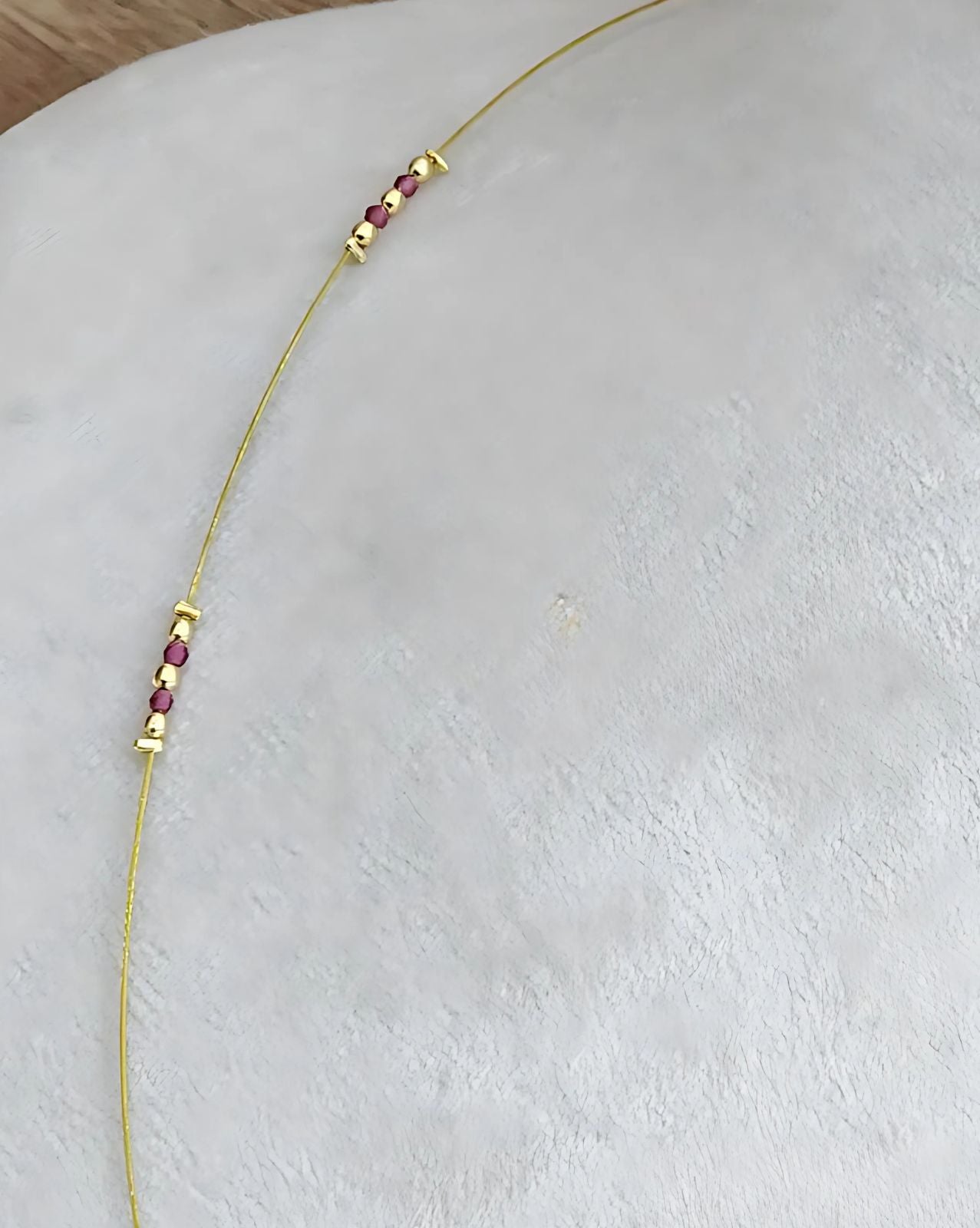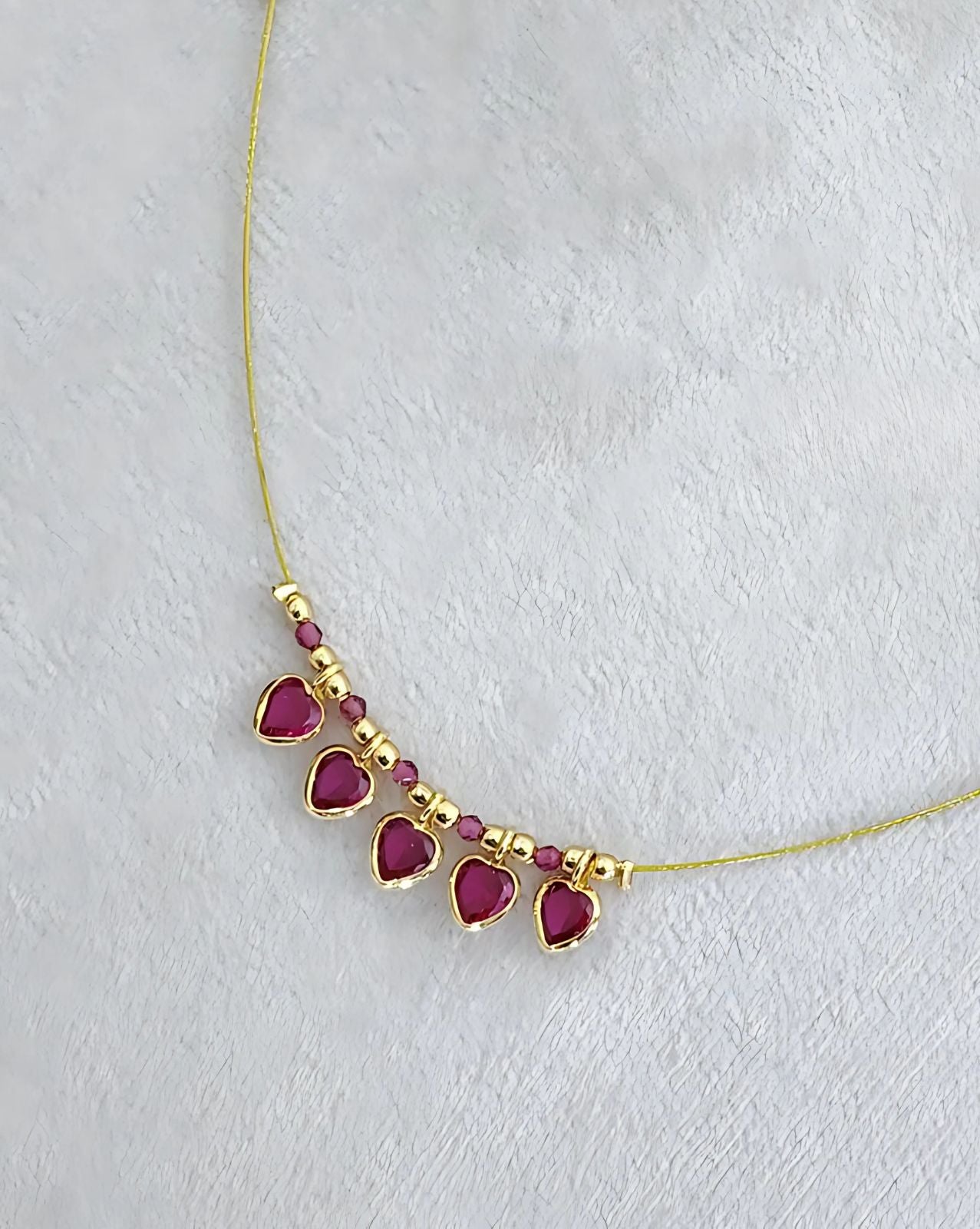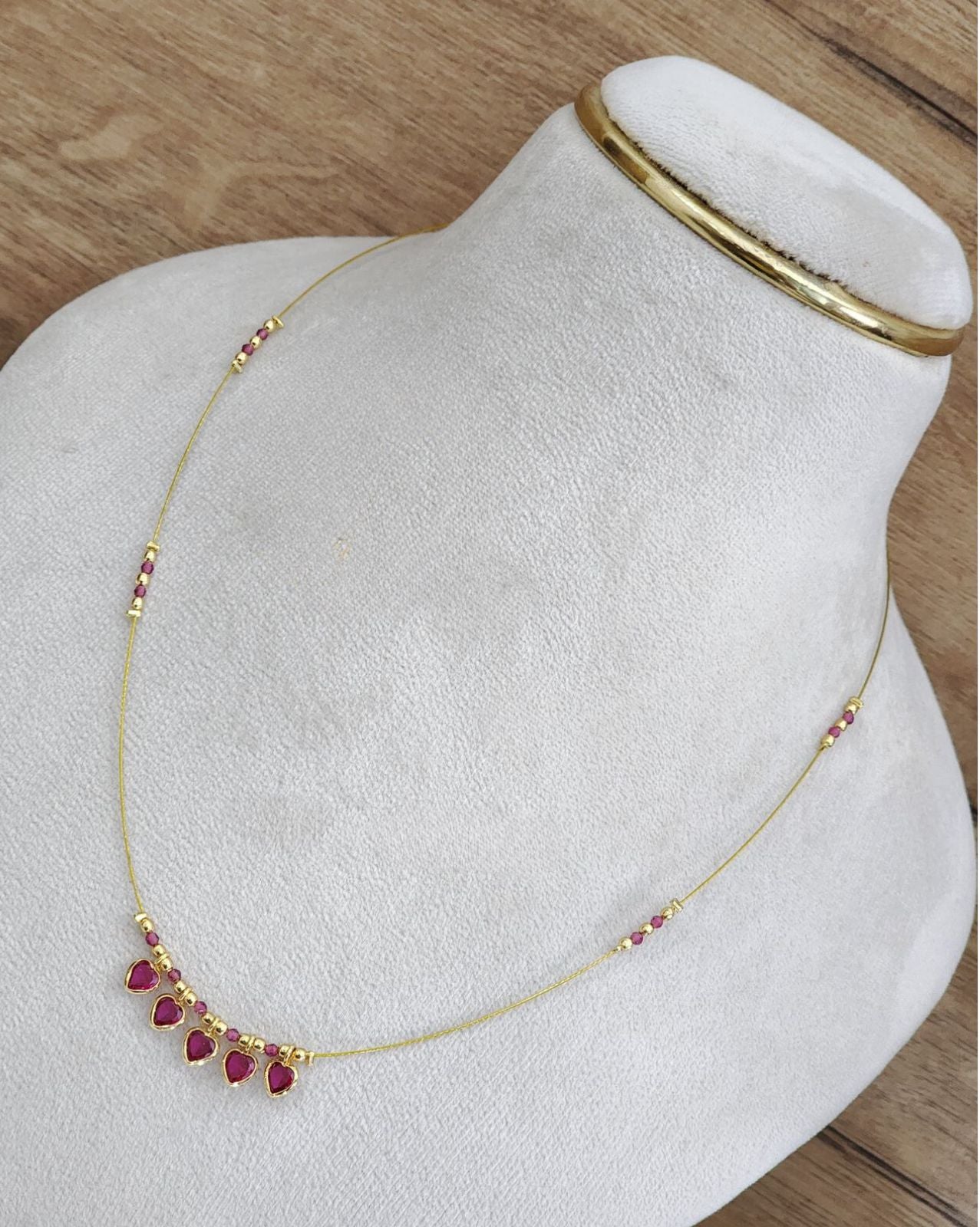 The Gold Ruby Invisible Necklace is a stunning piece of Indian jewelry that oozes both beauty and creativity. This necklace's sleek and seamless design features a succession of bright, closely-set rubies that appear to be floating without visible clasps or prongs. The "invisible" setting technique, in which the rubies are precisely positioned to conceal any metal structure, offers the necklace a smooth, continuous surface that gleams with rich red tones.