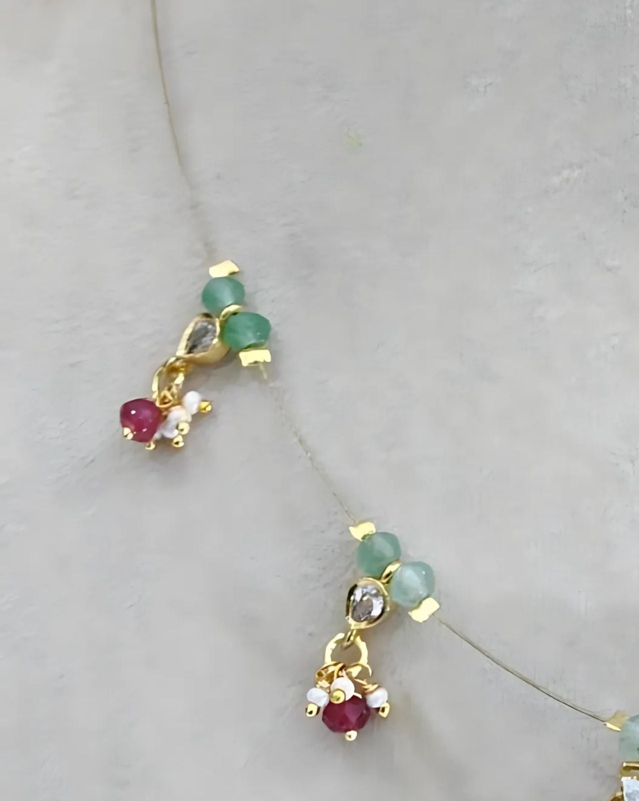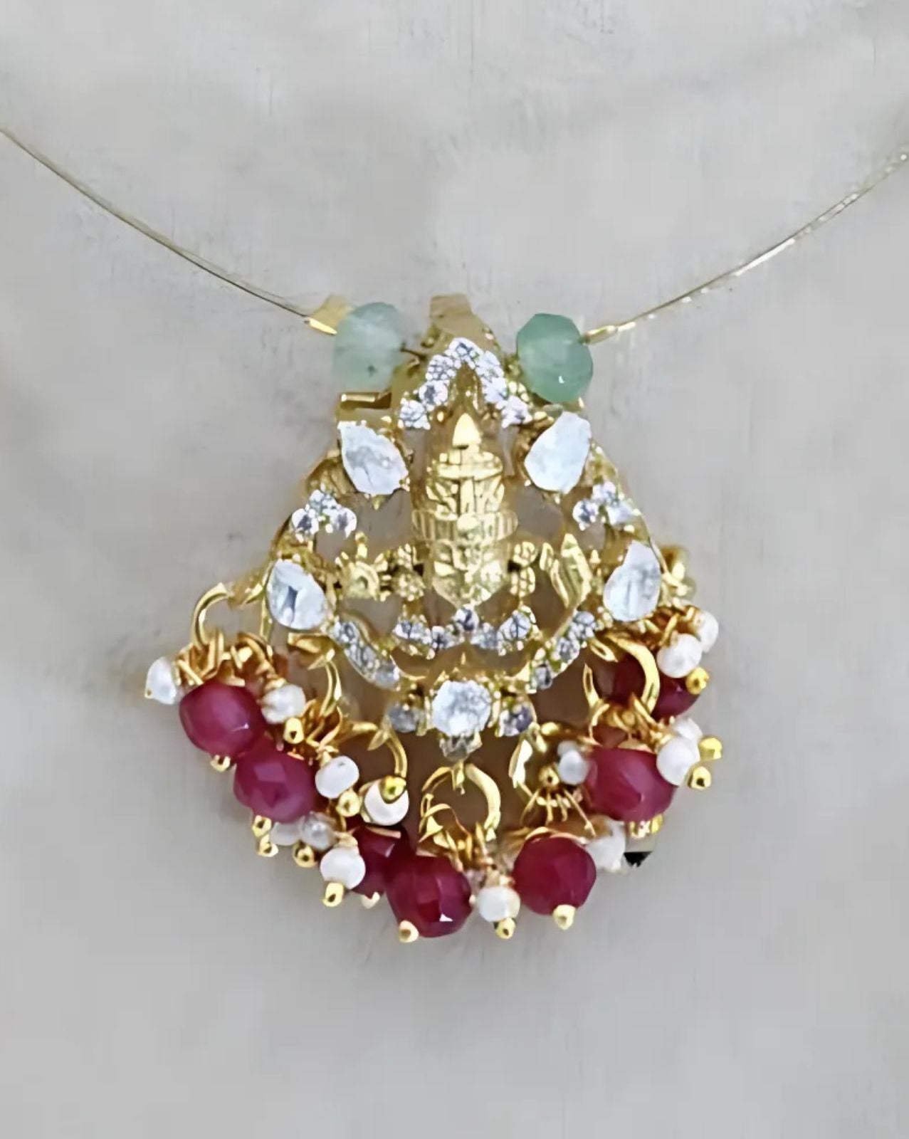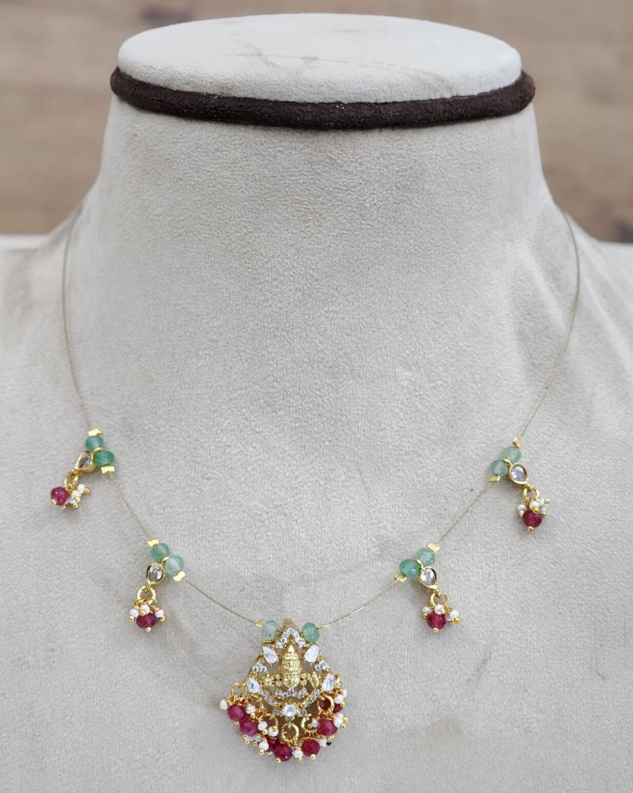 A sophisticated invisible chain necklace with moissanite stones and a central Balaji pendant design. Small clusters of red and green gemstones on either side of the chain provide a balanced and vibrant appearance, while the pendant displays traditional craftsmanship with a mix of red and white stones