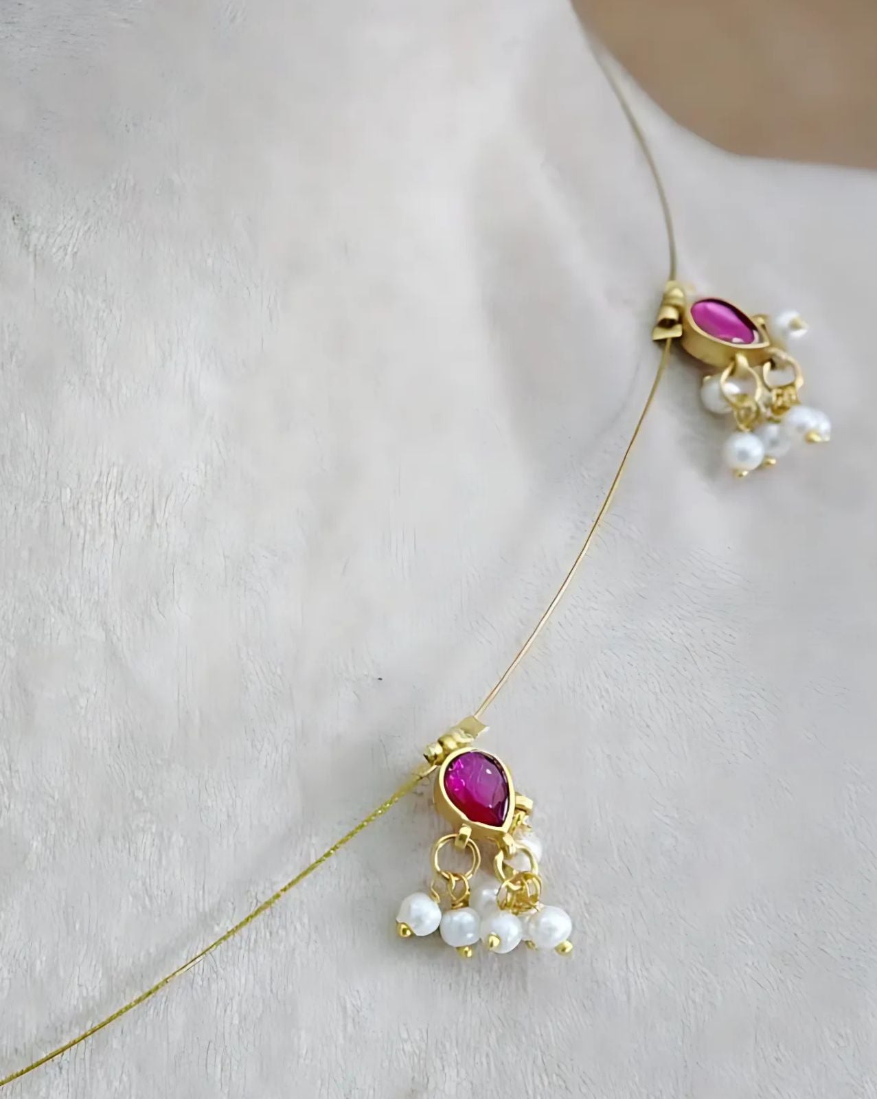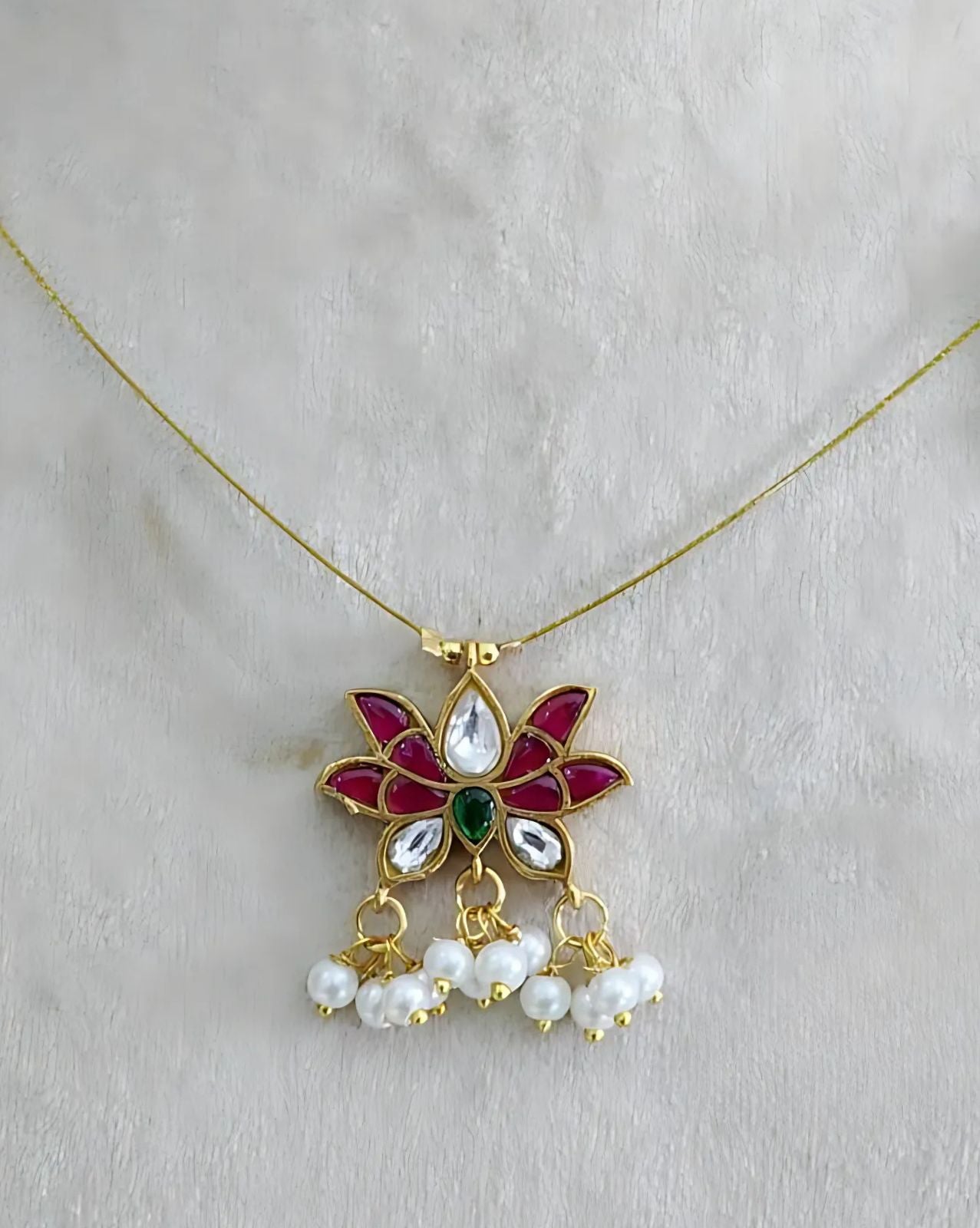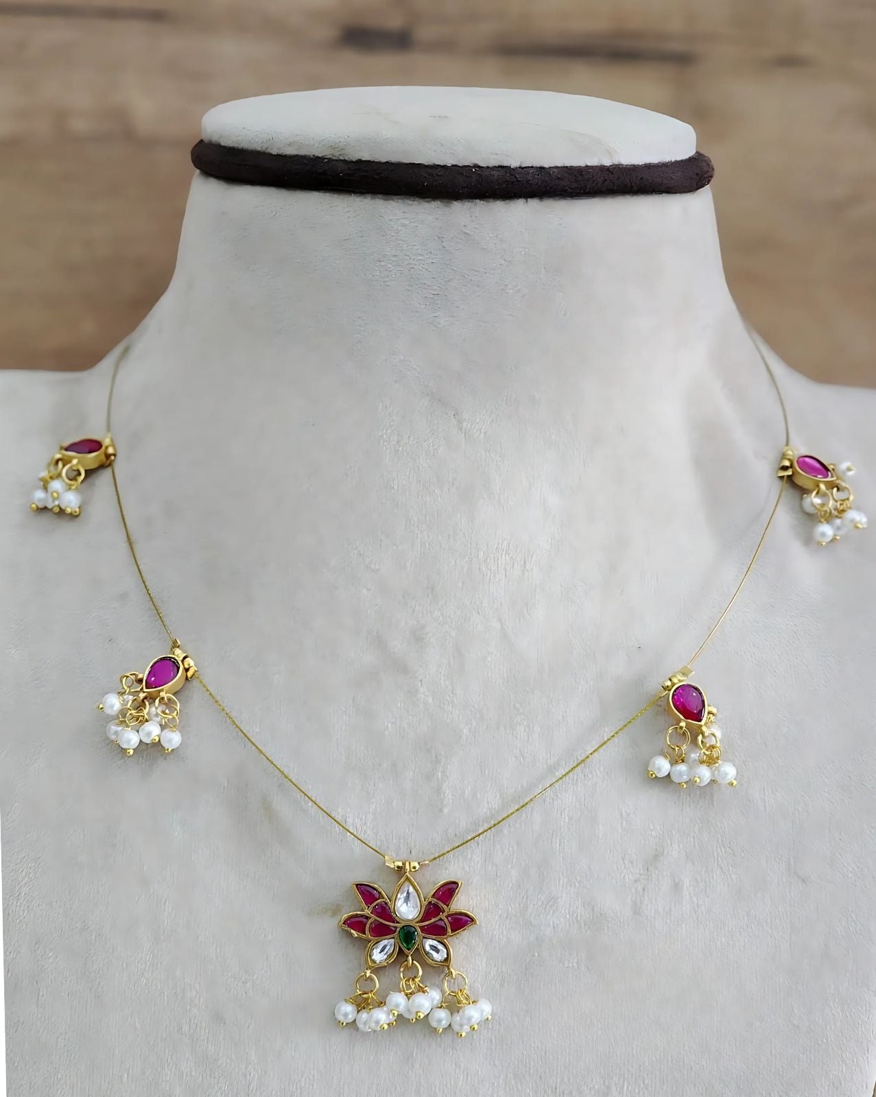An exquisite, invisible chain design adorns this tiny Jadau Kundan necklace. A circular gold motif frames the necklace's main pendant, which is embellished with beautiful floral Kundan work and set with red and green gemstones. A traditional touch is added by the three tiny, hanging gold jhumka charms that hang from the pendant.