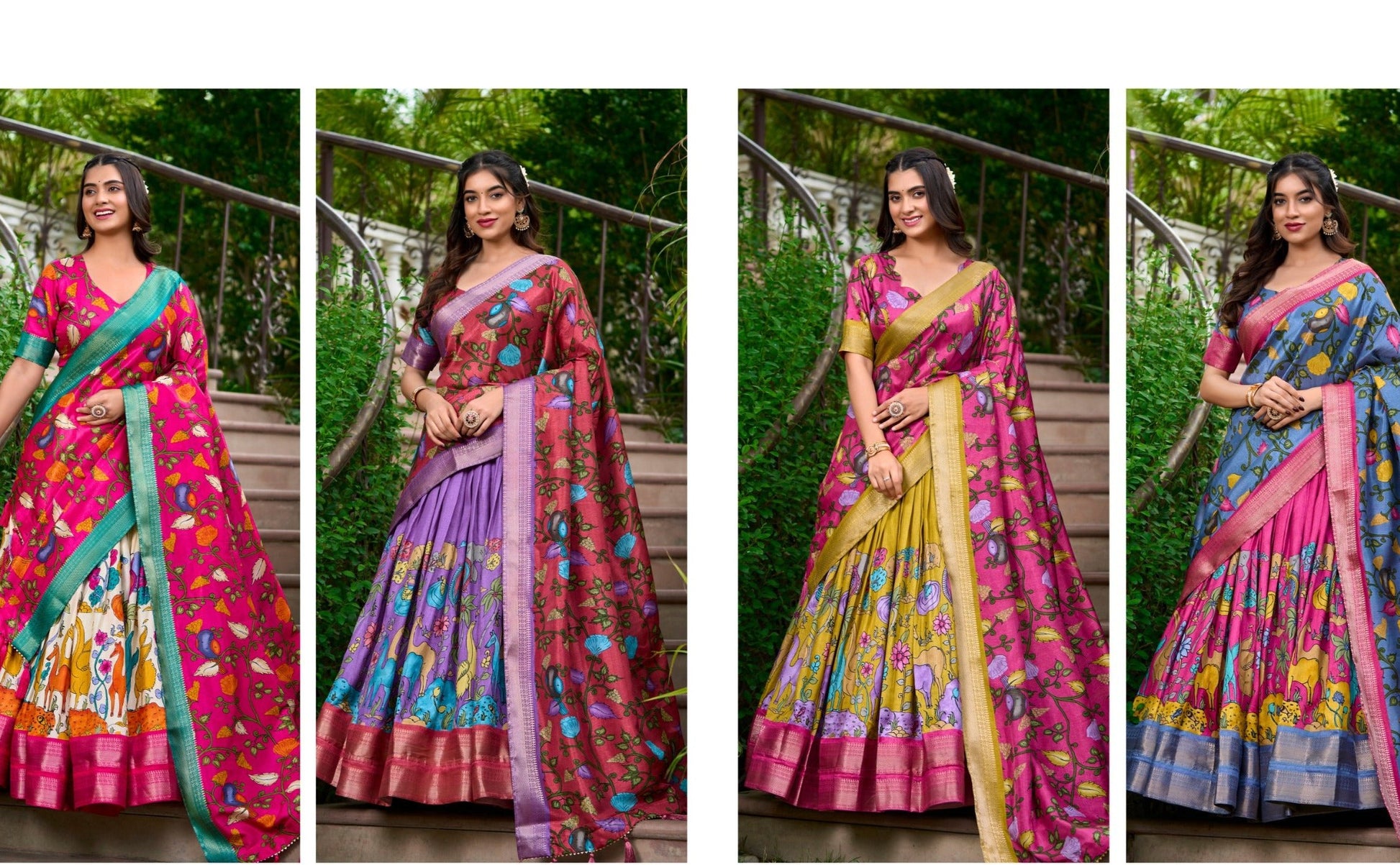 Elevate your style with this exquisite Dola Silk Kalamkari Lehenga Set, a perfect blend of tradition and modernity. The lehenga, crafted from premium Dola silk, features intricate Kalamkari prints enhanced with a rich zari weaving border, exuding elegance and charm. Designed for comfort and style, it comes with a convenient drawstring and zip closure, along with a canvas layer for a structured silhouette. The unstitched blouse in matching Dola silk showcases printed designs and a zari weaving border, allowing you to tailor it to your unique style. Completing the ensemble is a luxurious Dola silk dupatta adorned with Kalamkari prints, zari weaving borders, and tassels on both sides, adding a graceful finishing touch. Perfect for weddings, festive occasions, or cultural celebrations, this lehenga set is a timeless choice for any special event.