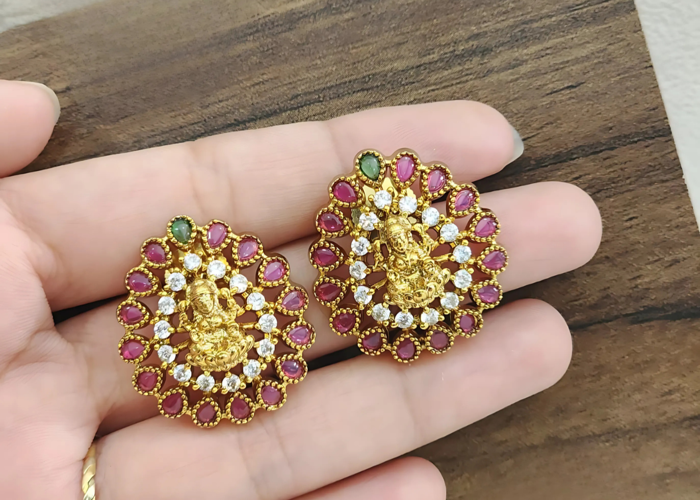 These Kempu Earrings are a classic addtion to your collection. This design around the central figure is a set of small, teardrop-shaped gemstones, predominantly ruby-red and a few small, bright green gemstones are interspersed. Also has small, white stones or crystals are also set in the design, adding to the overall decorative effect.
