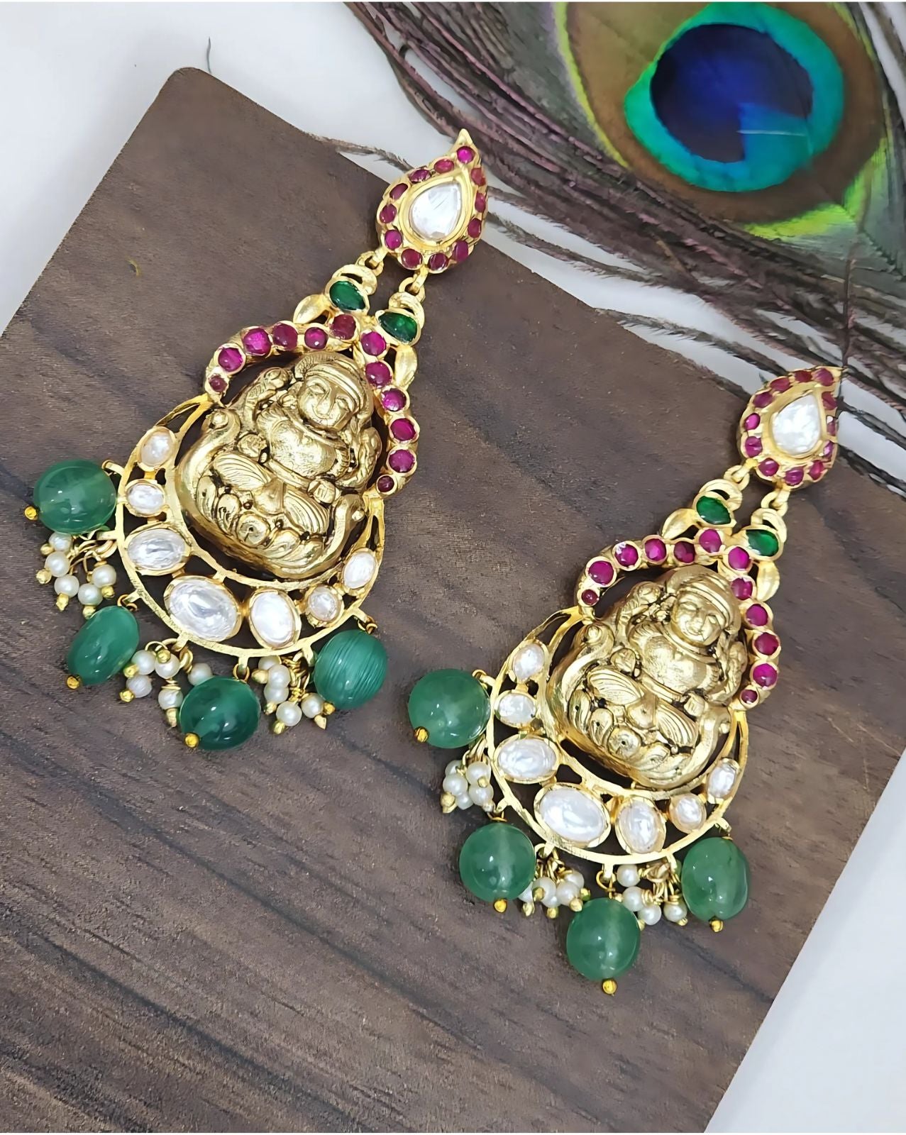 The god is surrounded by a classic arch-like arrangement of white kundan stones, green beads, and ruby-colored stones.