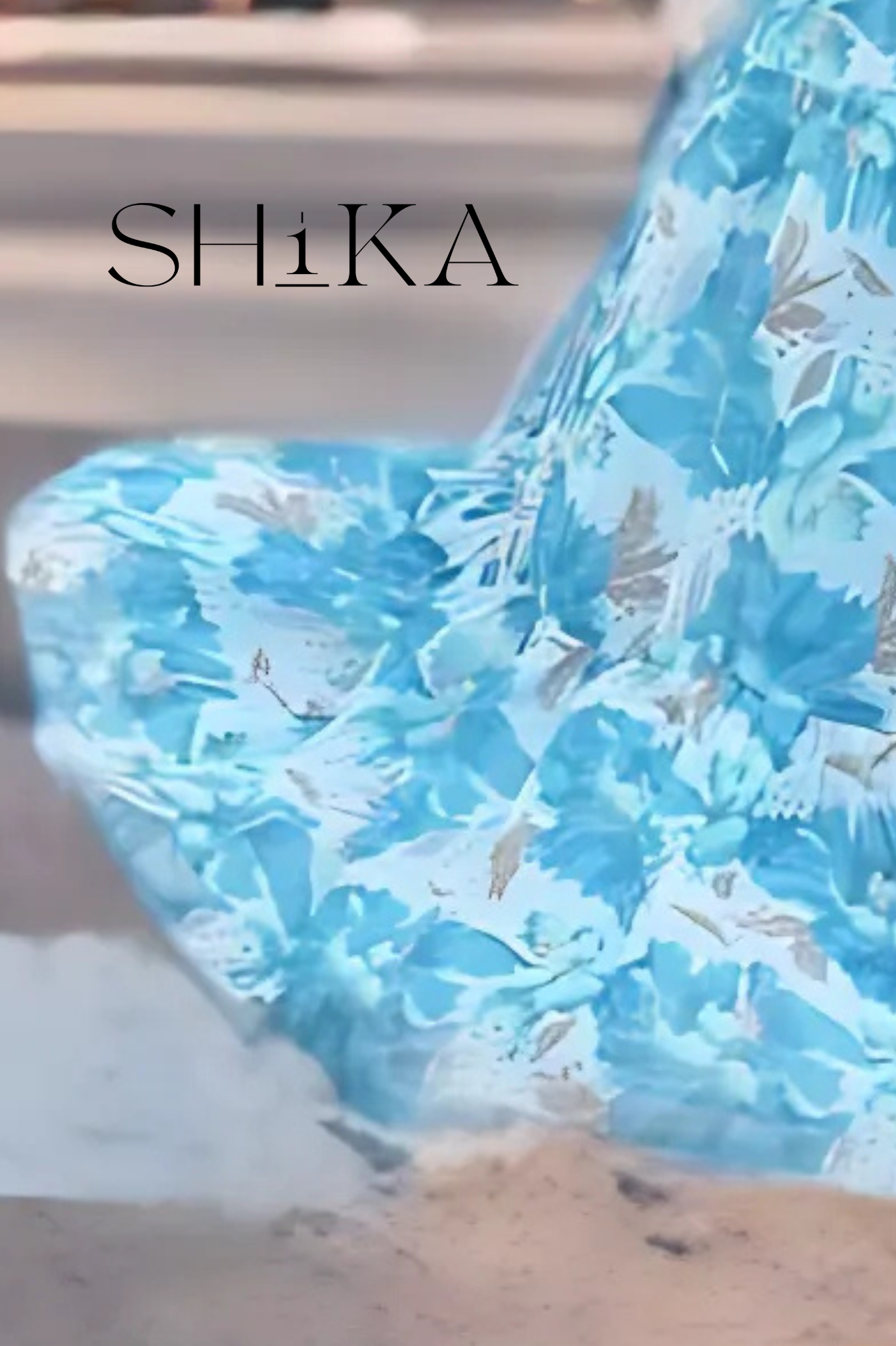 Elevate your style with this fully flared gown crafted from lightweight georgette fabric featuring an elegant print. Designed for a flattering silhouette, it comes with a full inner lining made from crepe for comfort from top to bottom. The gown features half sleeves and a stylish fancy V-neck, making it perfect for any occasion. Available in three beautiful colors: Peach, Purple, and Sky.
