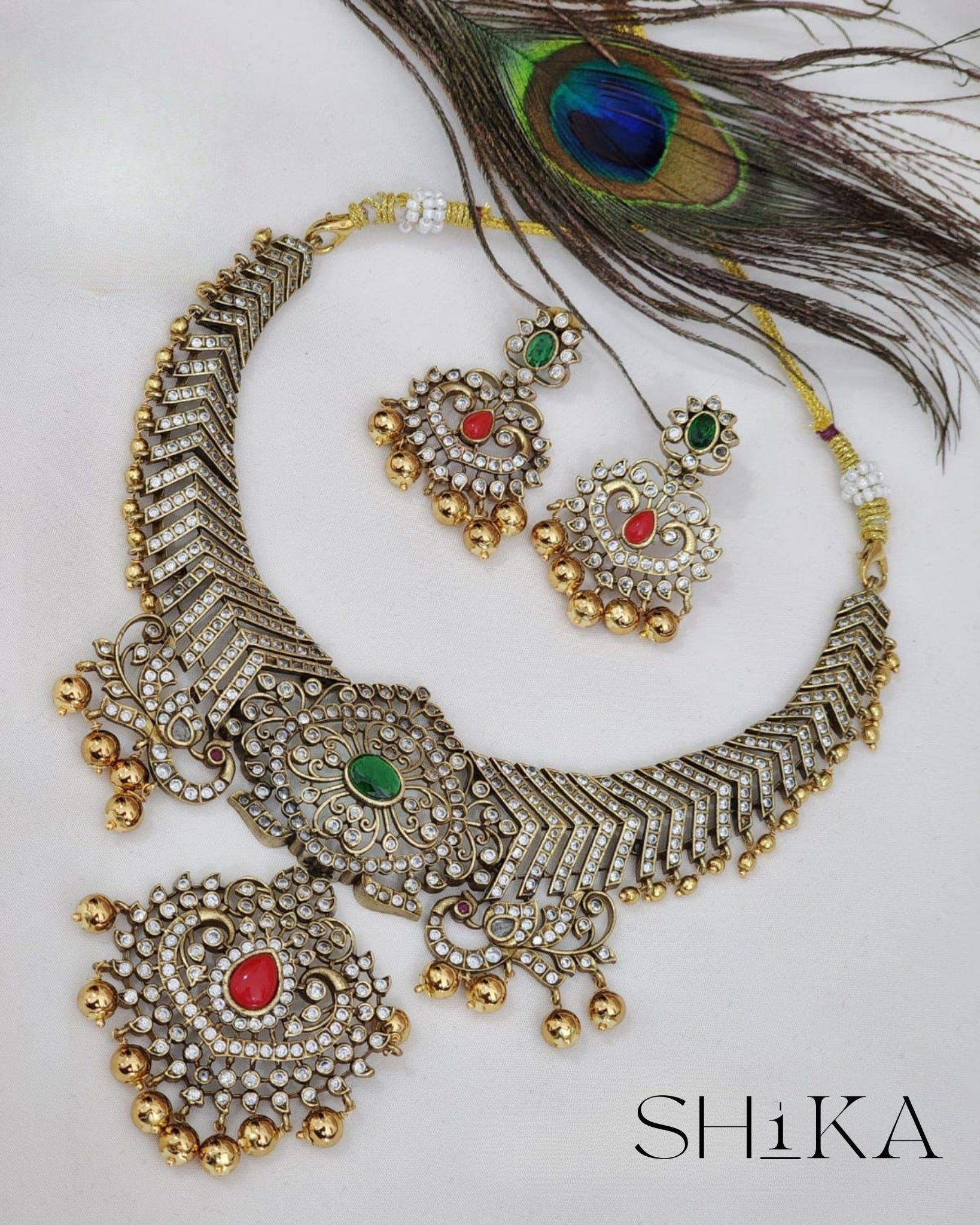 The Nooranjali Victorian Necklace Set exudes regal sophistication and timeless allure. Designed with intricate Victorian-inspired detailing, this necklace drapes gracefully to create a luxurious, heirloom look. Its refined craftsmanship and elegant silhouette make it an ideal choice for weddings, festive occasions, and grand celebrations. The set is completed with beautifully coordinated antique-plated earrings that enhance its classic charm.