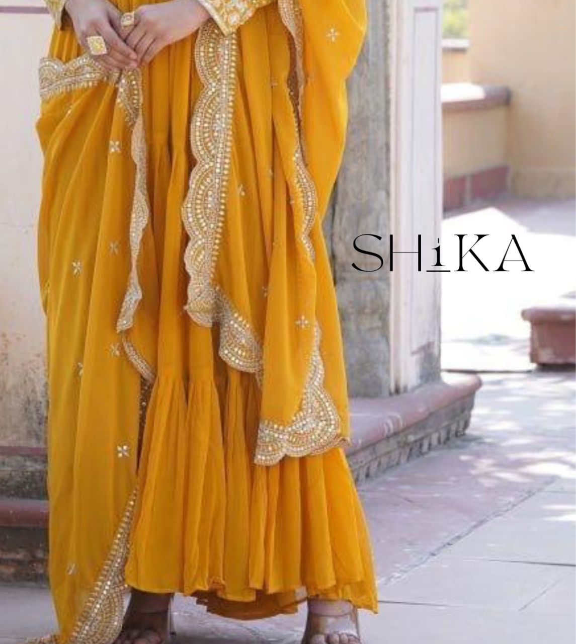 This stunning gown blends western style with Indian elegance, crafted from faux blooming and viscose jacquard fabric richly embroidered with sequins. The full inner cotton lining ensures comfort, while the 12-meter flare and frill stitching add dramatic flair. Paired with a matching dupatta featuring cutwork and sequin details, it’s perfect for festive occasions and special events.