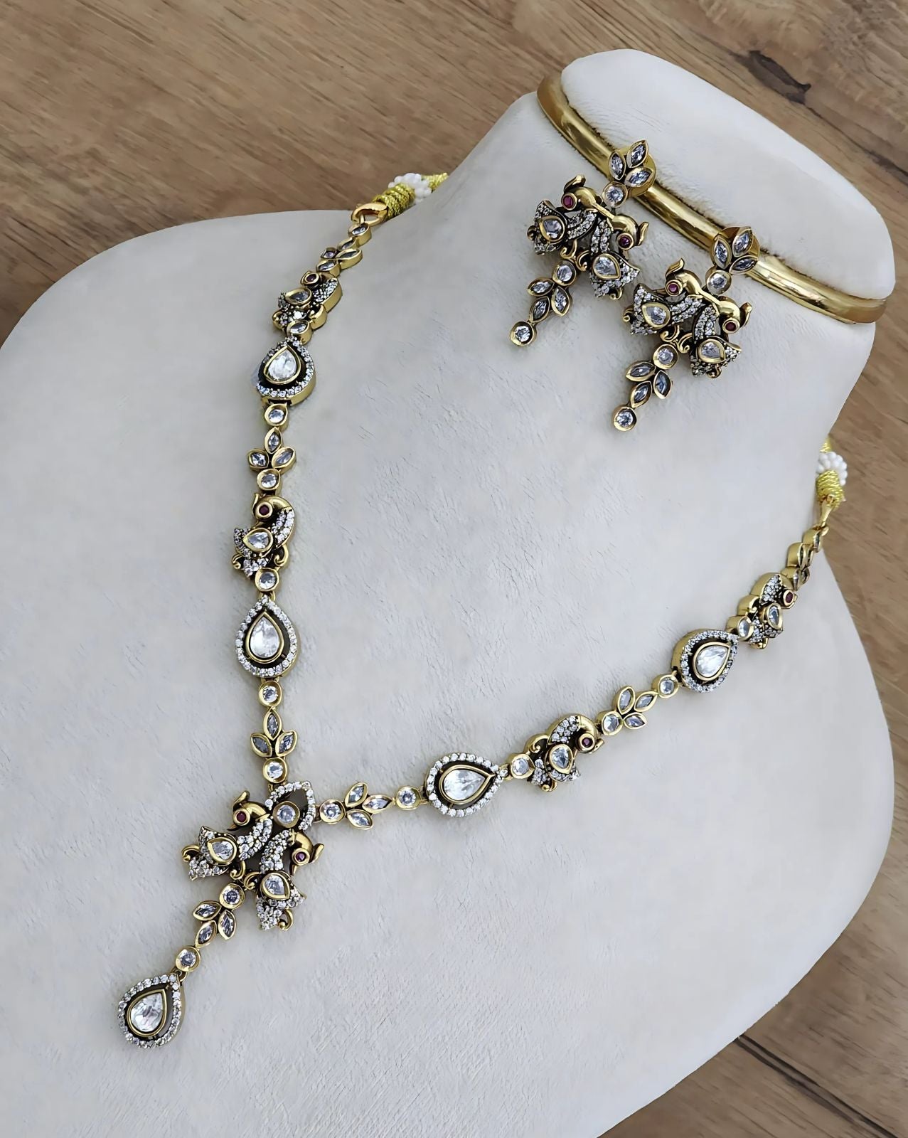 This necklace and earring set is a magnificent tribute to the grandeur of the Victorian era. The necklace adds a sense of antique enhancement with its delicately constructed links set with clear, teardrop-shaped stones. The vintage appeal of Victorian jewelry is reflected in the fine details of every element.