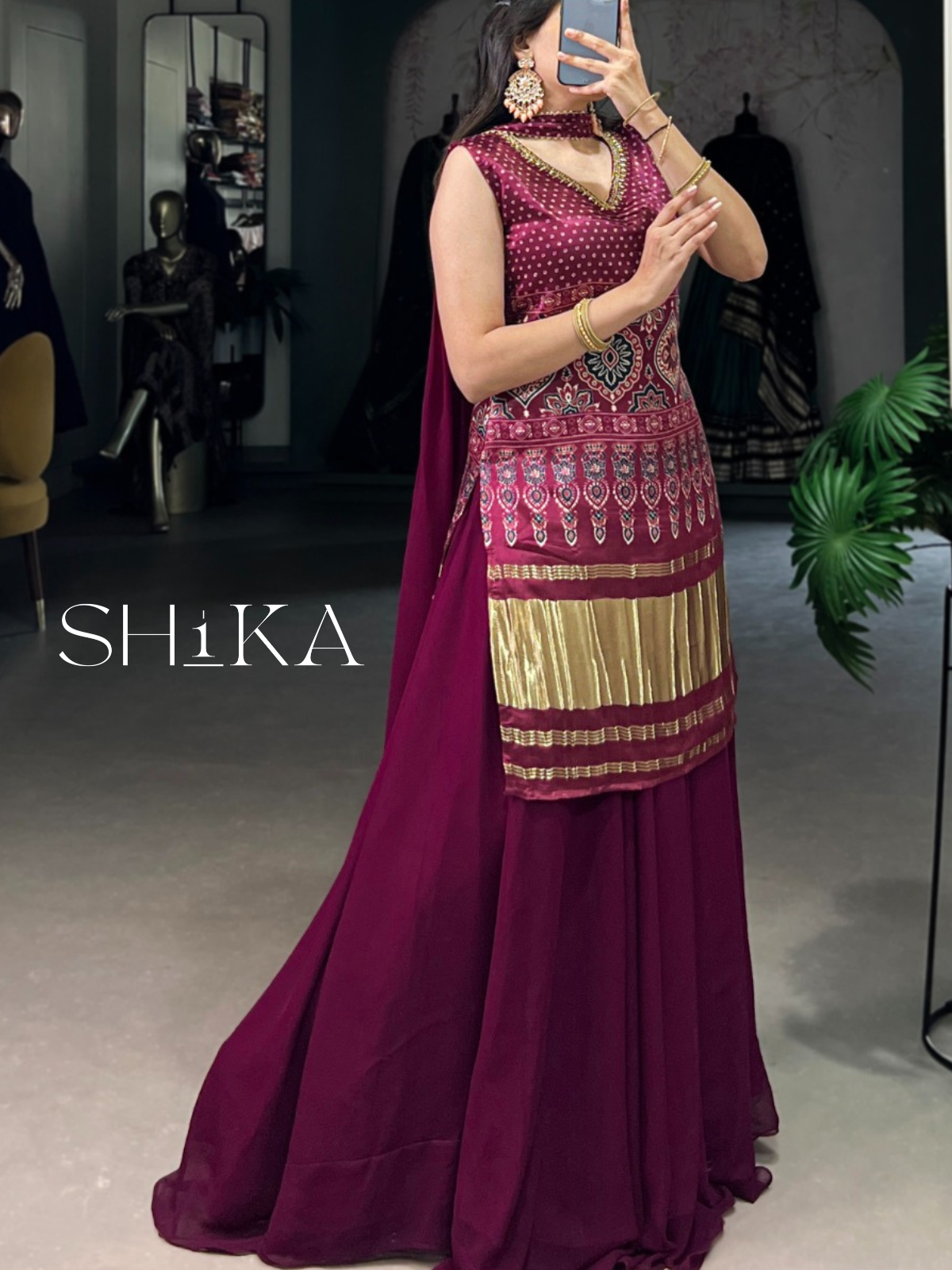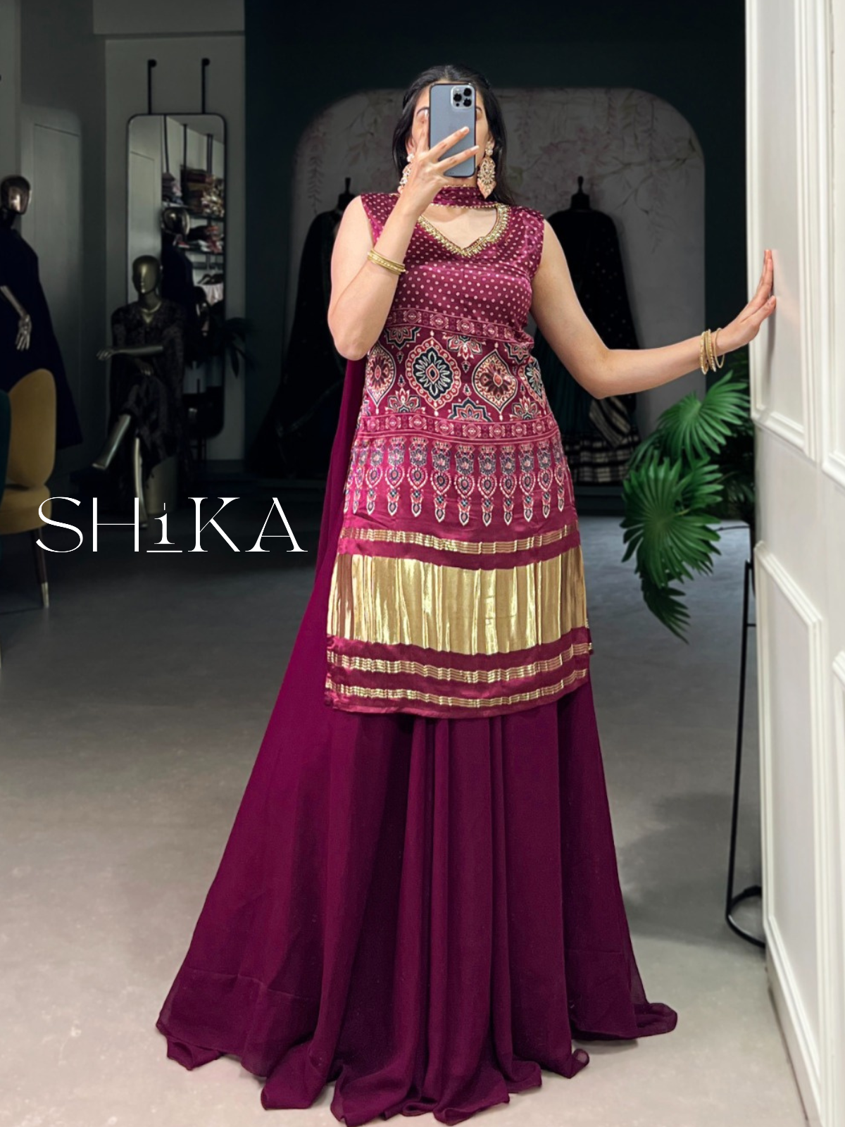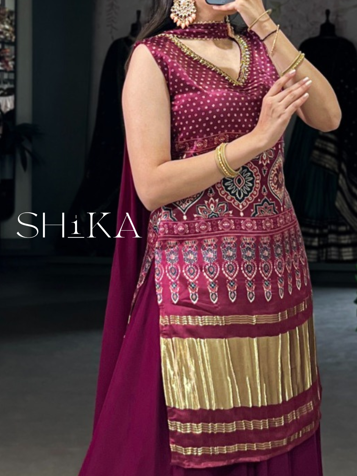 This elegant set includes a stitched gaji silk top featuring printed and handwork details with a comfortable adjustable chest fit. The plain georgette palazzo pants come with an elastic waistband for ease and style. A matching georgette dupatta with delicate lace trim completes the look, perfect for both festive occasions and casual wear.